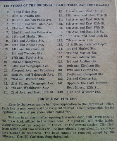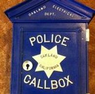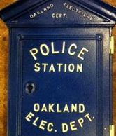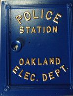 While the mention of a Police telegraph system start to appear on records as early as 1871 and were units attached adjacent to businesses in the core downtown and would transmit to the Telegraph office near 10th & Broadway. The first call boxes were documented in 1886 and listed at right. The early units were soon augmented with Telephone units and wet sell battery units. Improvements began post 1906 Earthquake, that created Oakland's own Fabrication and Instrument facilities. As a result of these improvements, Oakland started to develop its own Police and Fire Call boxes and poles. These first units were placed on the streets of Oakland in 1910 as pictured on the right. After the completion of the present Oakland facilities in 1914, the new City Hall housed the the Oakland Police Department and Dispartch and police signalling were created. On the Top of City hall, a Red Flashing beacon was installed to alert officers to call in.As the City expanded the need for additional alerting methods were needed , the White globes on the top of poles that contained Police Call boxes were replaced with a Red "flashlight" as pictured at right. During this same period, two police substations were created in the newly annexed North and East Oakland. They were known as Temescal and Fremont Stations, respectively. These substations were in existence until December of 1954, when the substations were closed and operations shifted to Central Police in 1955. This same move changed the look of the Oakland Call Boxes and from that change , the doors on the new call boxes were minus the work STATION. In 1969, Rotary dial phones were installed in the Call Boxes as the City Hall operator was eleiminated. The next change to the Oakland boxes occurred in 1989, when phones were installed that could transmit and receive calls and in 1991, The doors were changed to the "star" design, slimline phones were installed and the poles were shortened to "vehicle window" height. This allowed officers to drive up and bring the phone into the car and also allowed for modem connections for their laptop computers. With the polliferation of Cell phones, the need for call boxes faded and in 2005 the boxes were removed.